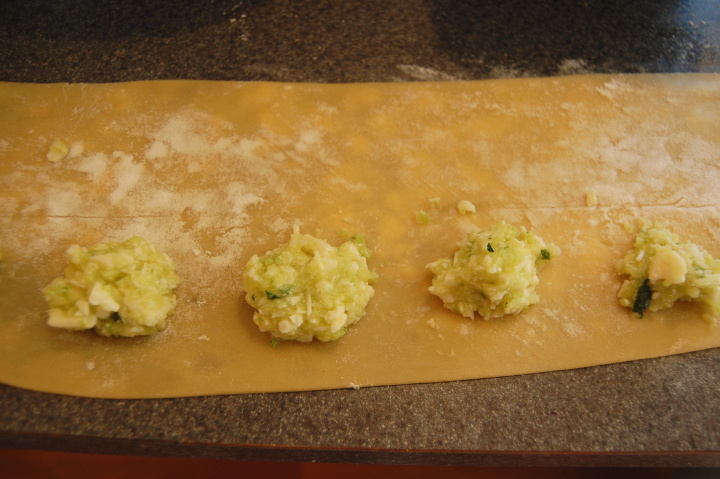 Put the mixture in a strainer and push at it so that the extra liquid leaves the zucchini. It’s important to do this to avoid liquid-y ravioli. Leave the mixture sitting in the strainer until it’s time to use it so extra liquid can drain out.